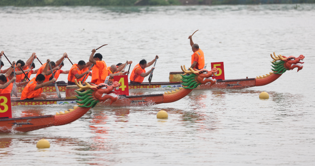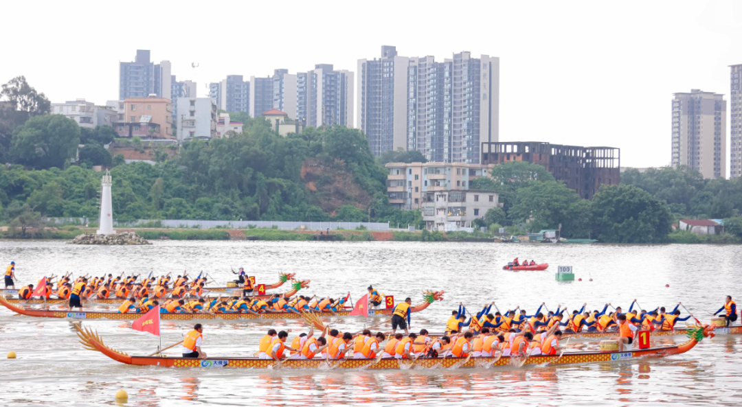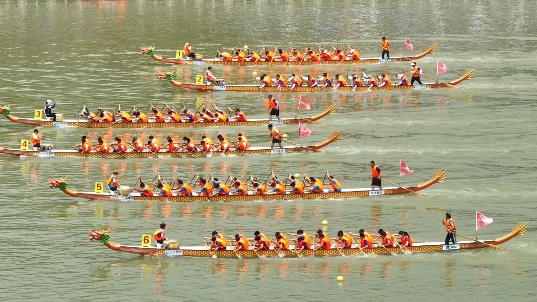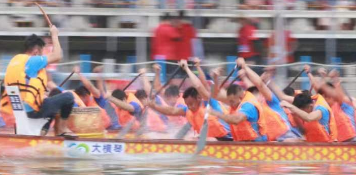 云旗獵獵,鑼鼓頻催。賽場上,在富有節(jié)奏的鼓聲下,整齊劃一的動作,奮力揮槳、劈波斬浪,河面上演著“速度與激情”。