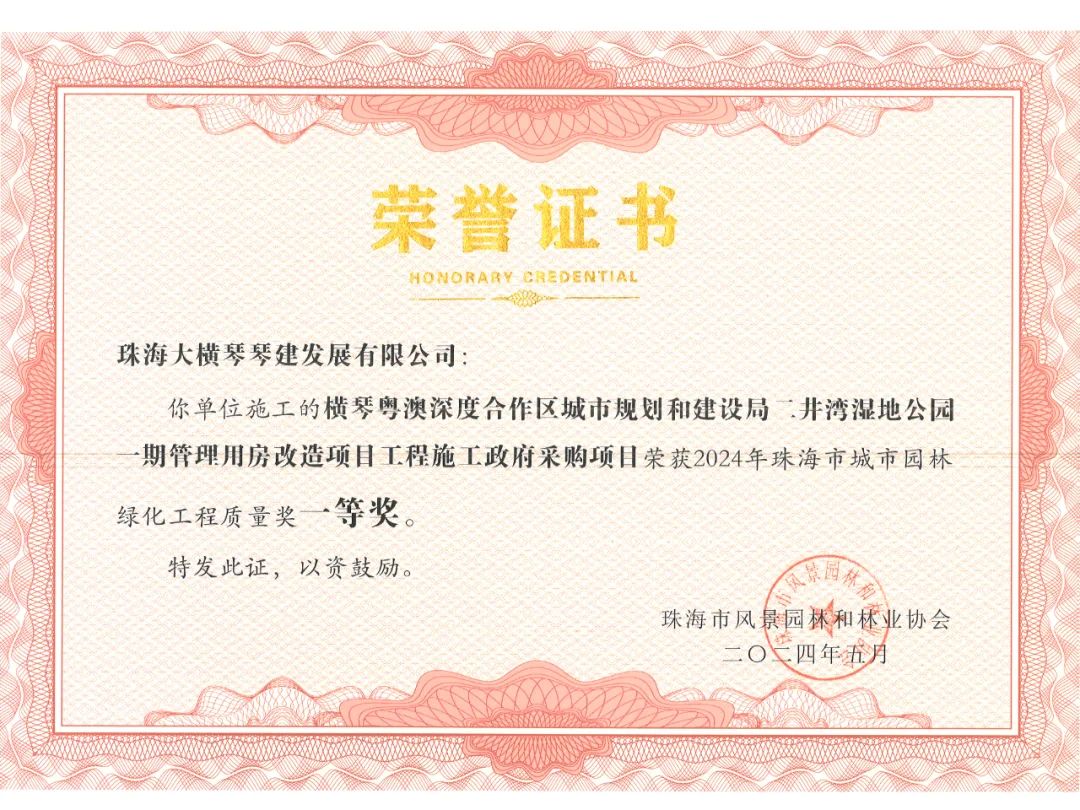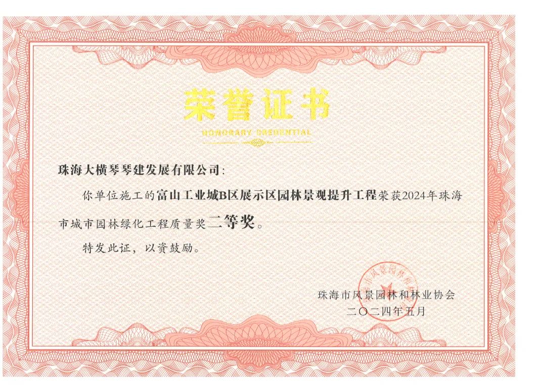 橫琴粵澳深度合作區(qū)城市規(guī)劃和建設(shè)局市政管理署2023年專類公園綜合管養(yǎng)政府采購(gòu)項(xiàng)目、橫琴粵澳深度合作區(qū)城市規(guī)劃和建設(shè)局二井灣濕地公園一期管理用房改造項(xiàng)目工程施工政府采購(gòu)項(xiàng)目,榮獲2024年珠海市城市園林綠化工程質(zhì)量獎(jiǎng)一等獎(jiǎng)!富山工業(yè)城B區(qū)展示區(qū)園林景觀提升工程,榮獲2024年珠海市城市園林綠化工程質(zhì)量獎(jiǎng)二等獎(jiǎng)!