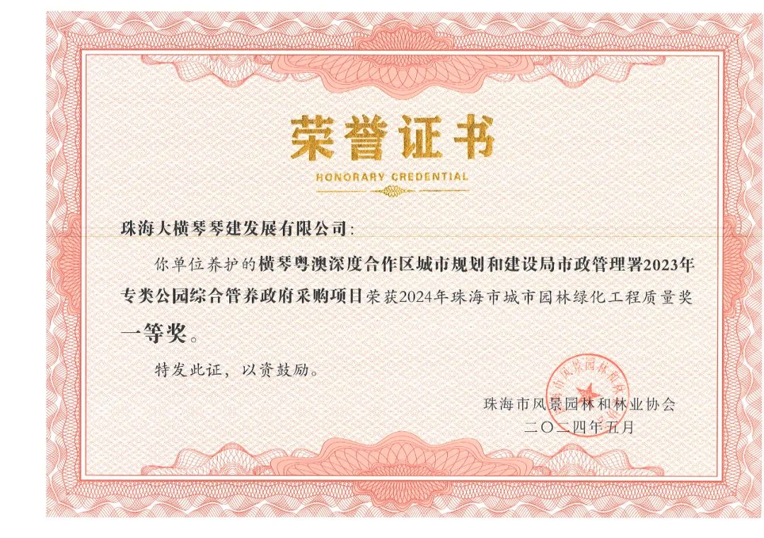 珠海市城市園林綠化工程質(zhì)量獎(jiǎng)是本市園林綠化工程類的重要獎(jiǎng)項(xiàng),旨在提高景觀園林綠化建設(shè)的質(zhì)量和水平,評(píng)選出在全市具有引導(dǎo)和示范作用的景觀園林綠化優(yōu)秀工程及養(yǎng)護(hù)項(xiàng)目。本次獲獎(jiǎng),是珠海市風(fēng)景園林和林業(yè)協(xié)會(huì)對(duì)大橫琴集團(tuán)管養(yǎng)項(xiàng)目、施工項(xiàng)目與代建項(xiàng)目品質(zhì)的認(rèn)可與鼓勵(lì)。同時(shí)也是大橫琴集團(tuán)在貫徹落實(shí)市委、市政府關(guān)于“綠美珠海生態(tài)建設(shè)”工作部署中取得的階段性成效。