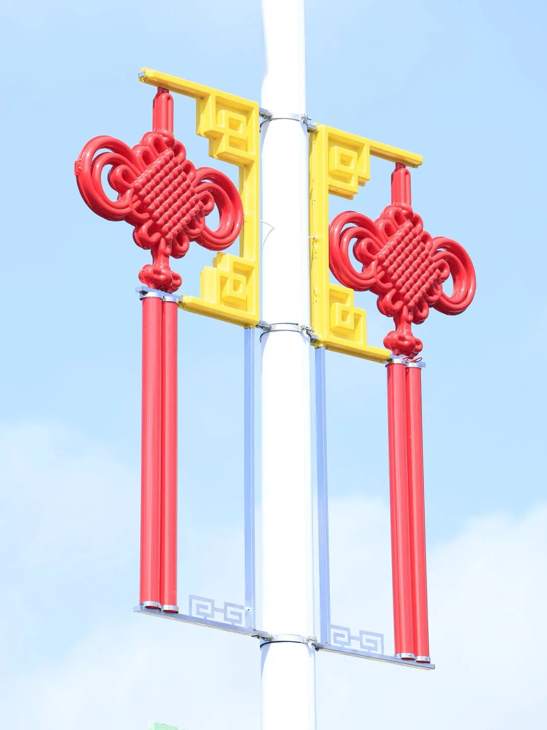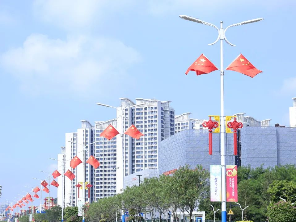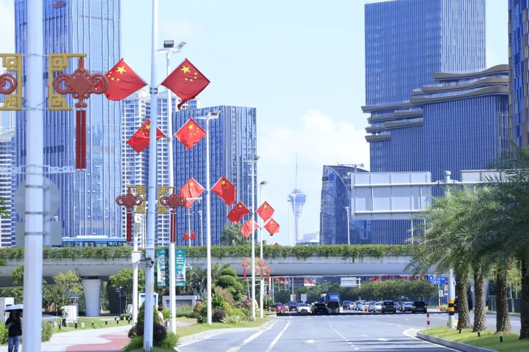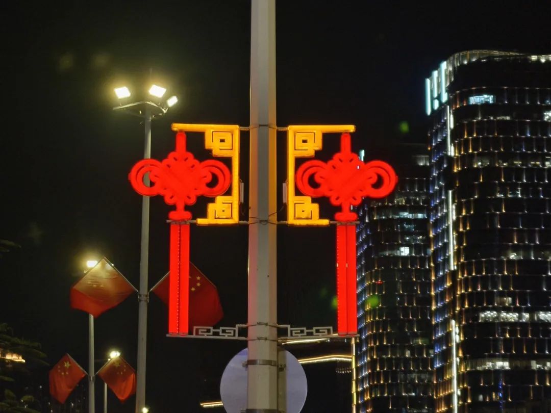大橫琴城資在港澳大道、環(huán)島西路等重點(diǎn)路段懸掛了 230套中國結(jié),以亮麗的形象喜迎國慶。