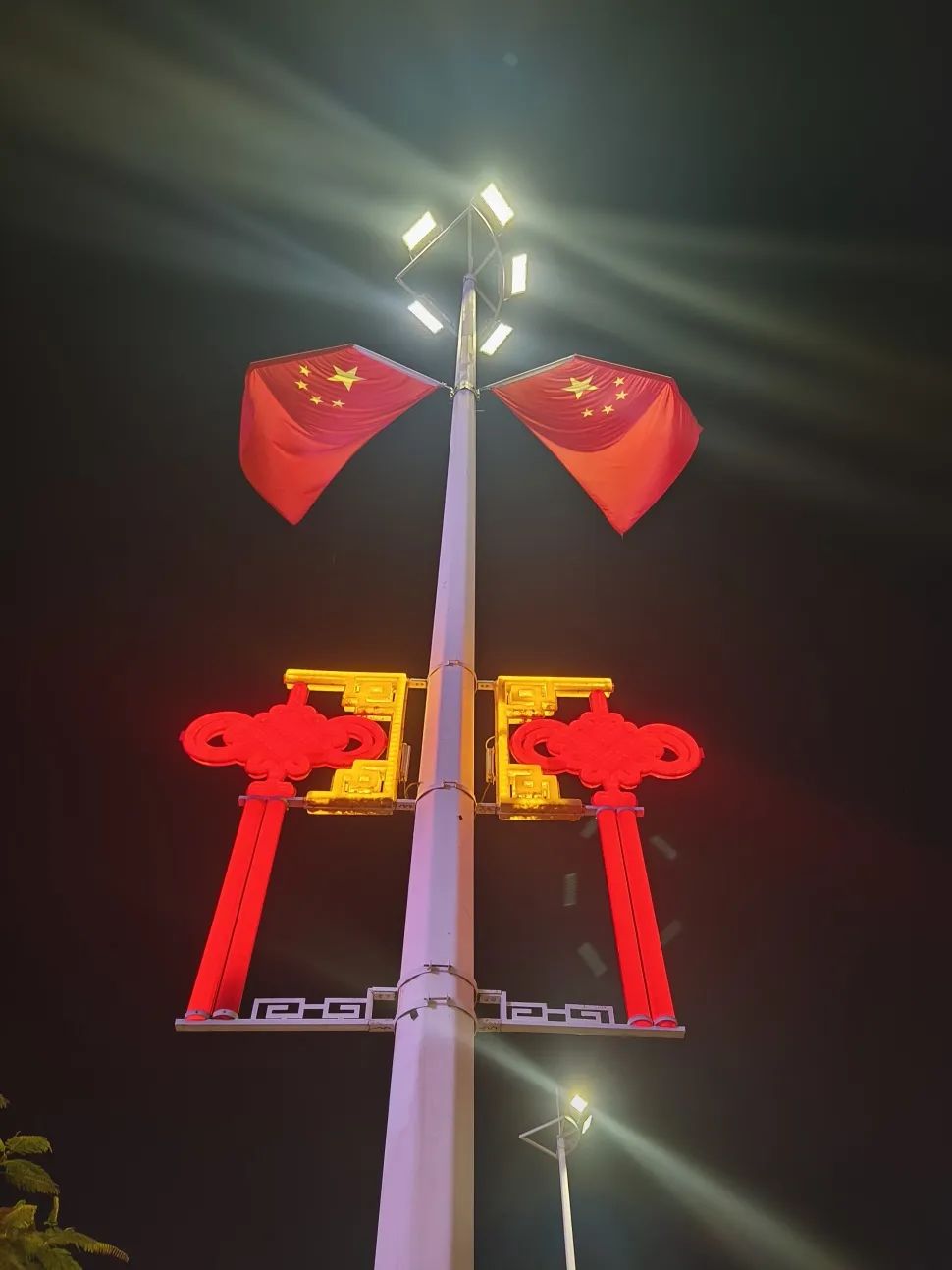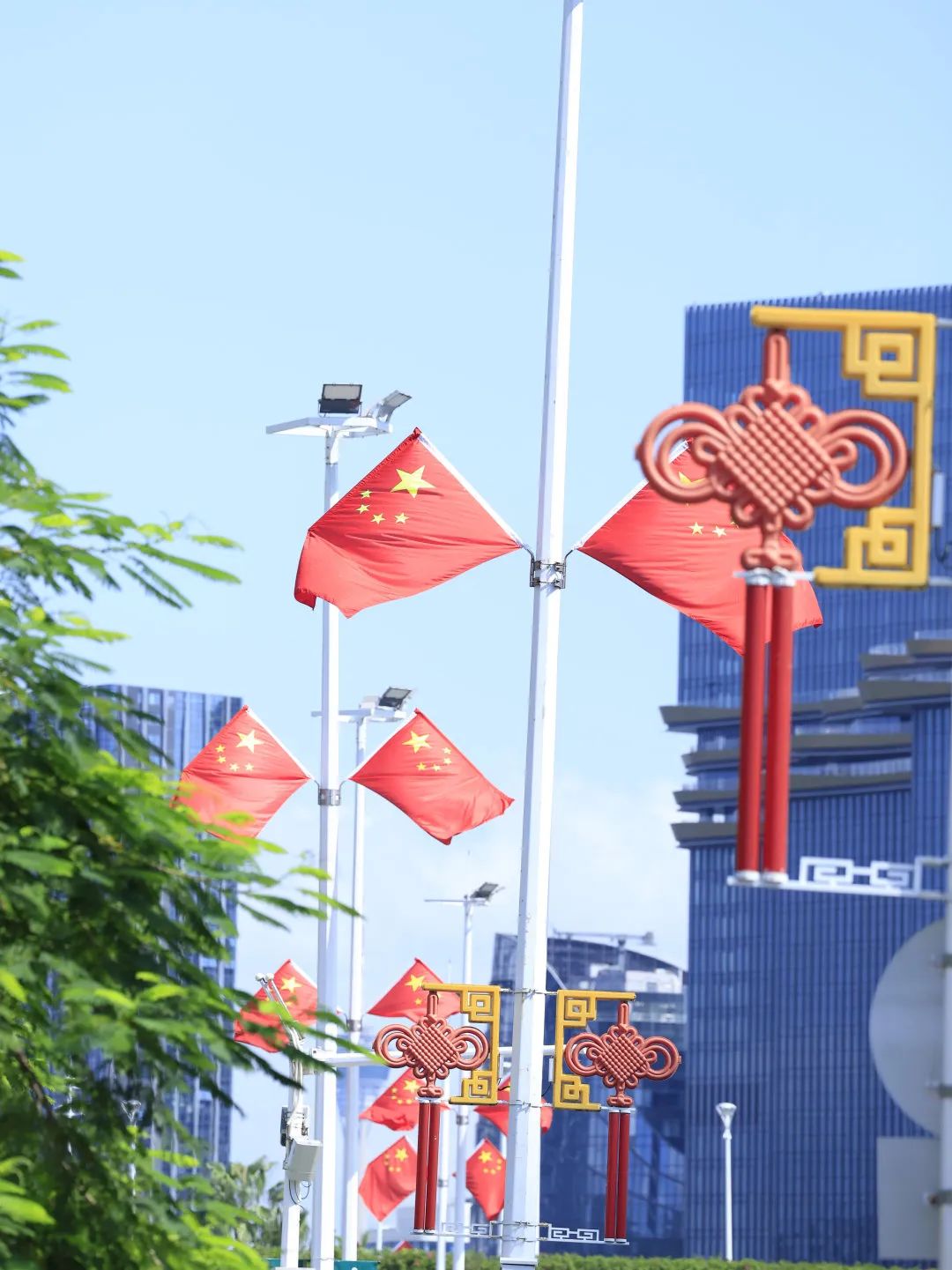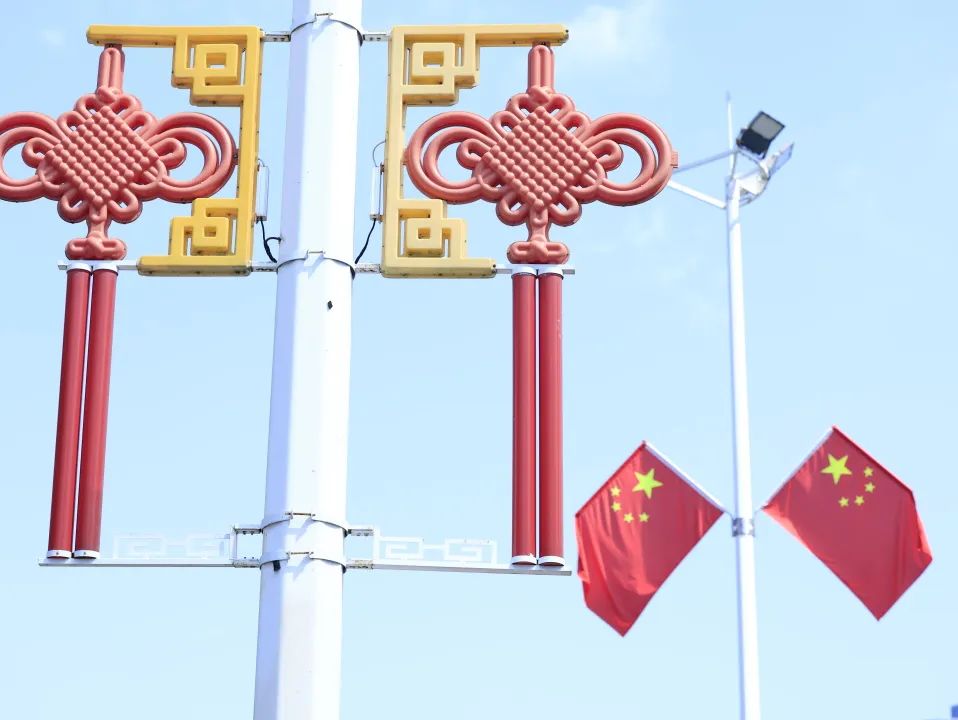 喜慶的中國結(jié)與迎風(fēng)飄揚(yáng)的五星紅旗交相輝映