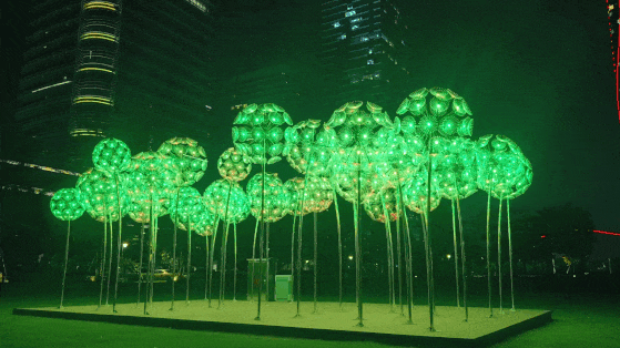 在橫琴金融島中央公園,40支高度為2.5米、直徑為0.6米的蒲公英燈飾如同希望的使者,散發(fā)著明亮而溫暖的光芒,為夜幕下的公園增添了一份璀璨的光彩。