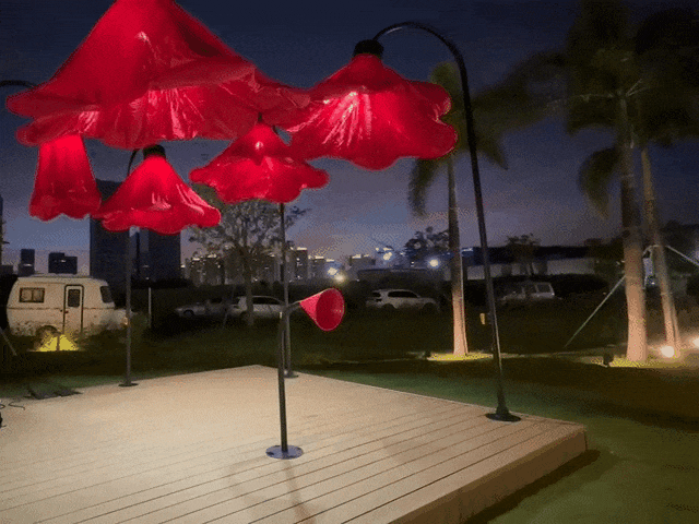 夜晚,當(dāng)游人經(jīng)過,在喇叭裝置處說出“熱烈慶祝中華人民共和國成立75周年”、“熱烈慶祝澳門回歸祖國25周年”等祝福語時,花朵會自動打開并亮燈,創(chuàng)造出驚喜的互動體驗(yàn)。