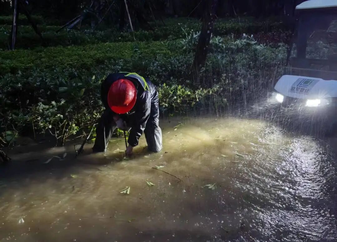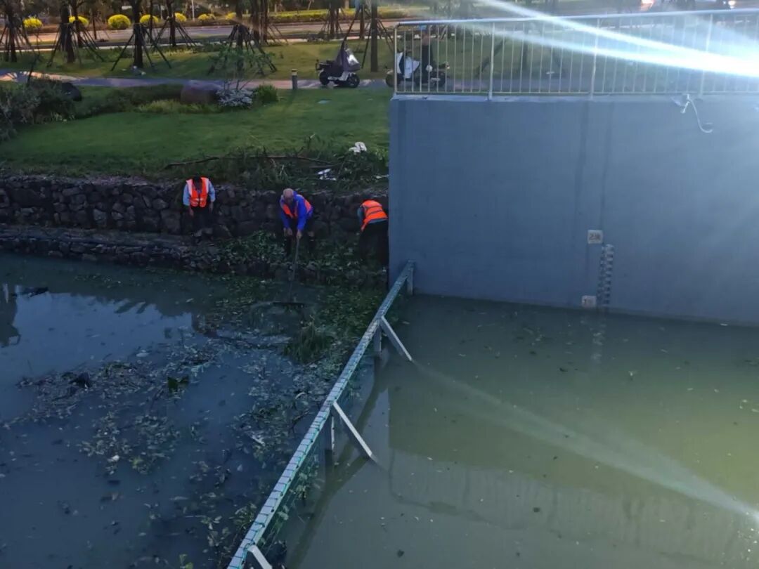 臺風(fēng)期間,受風(fēng)暴潮影響,橫琴天沐河水位上漲,珠光集團(tuán)迅速組織搶險力量,通過加筑沙袋有效阻止海水倒灌進(jìn)天沐河,同步安全轉(zhuǎn)移設(shè)備設(shè)施,并緊急安裝抽水設(shè)備清理積水,避免變電房被水浸泡。臺風(fēng)過境后,搶險隊伍立即投入后續(xù)清理工作,第一時間清理泵站進(jìn)水口垃圾,保障泵站排水通暢,降低村渠水位;清理排水口垃圾,保障土渠排水暢通;并全力協(xié)助合作區(qū)市政管理署,清理倒塌的邊境圍網(wǎng)。